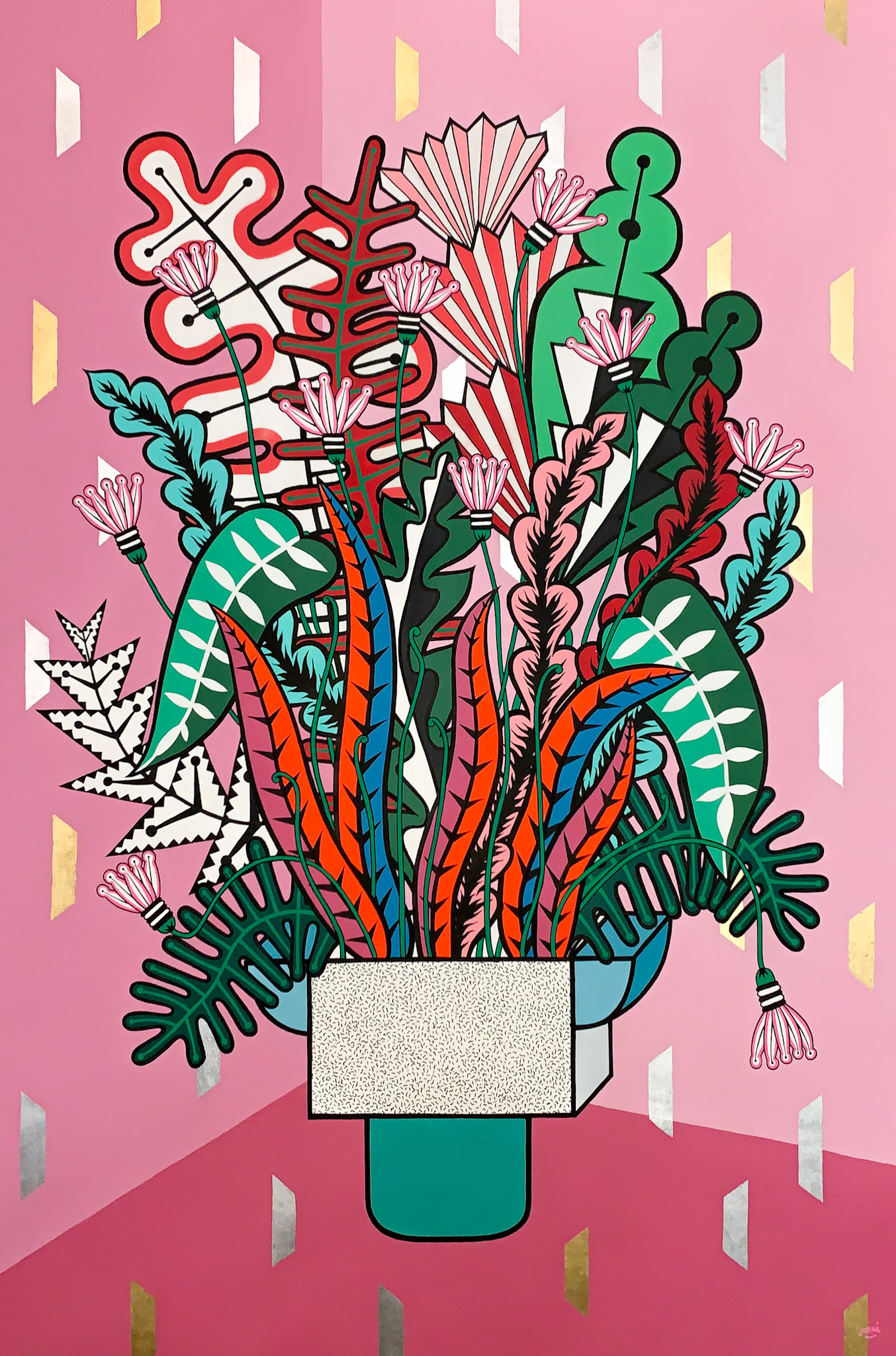 Acrylique, aérosols, feuille d'or et d'aluminium