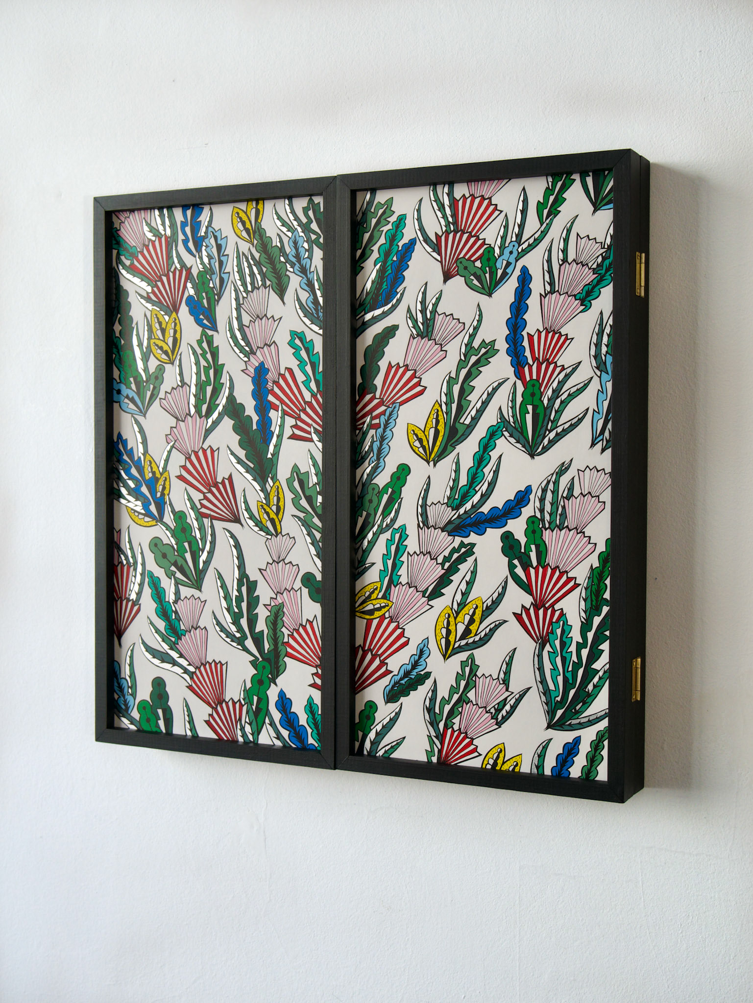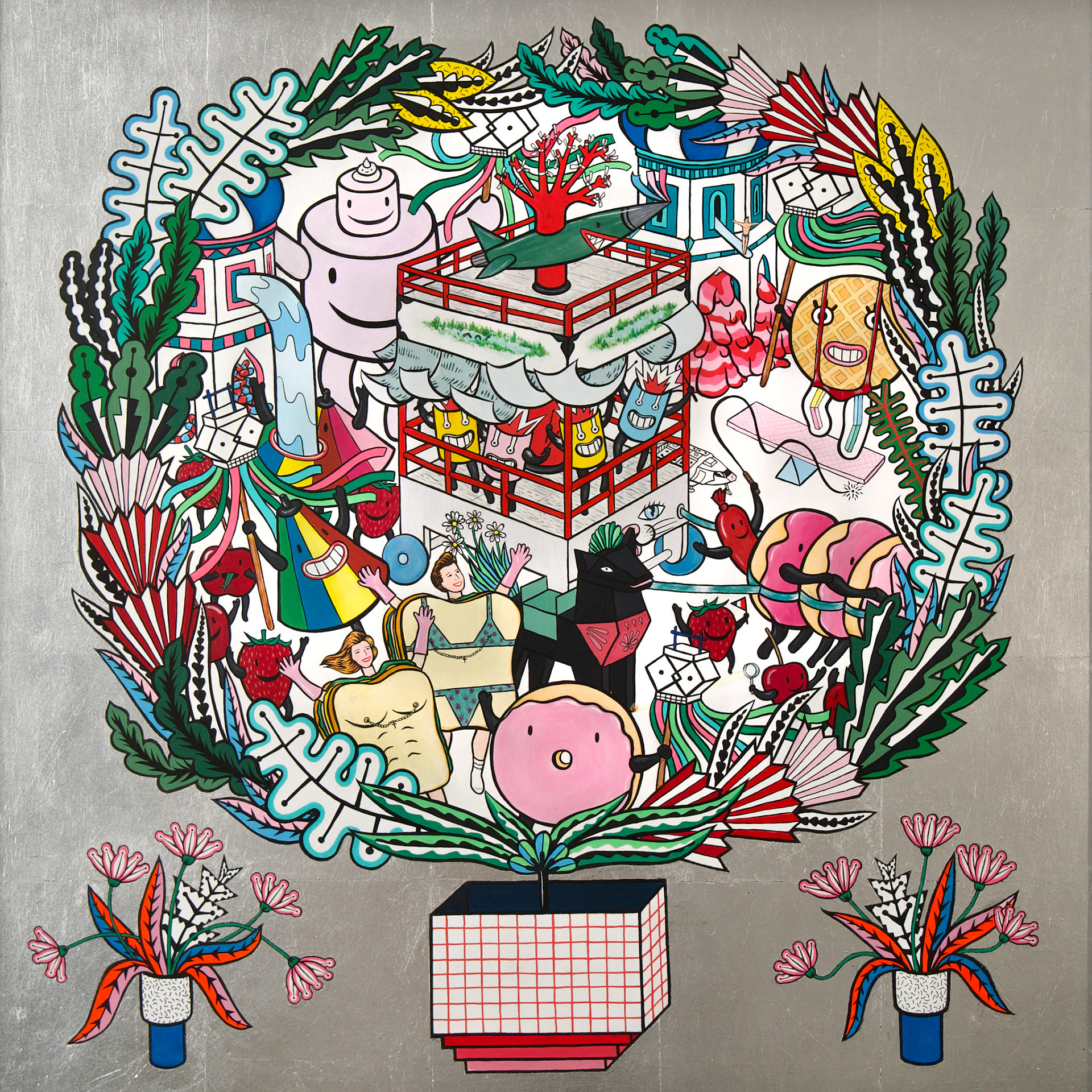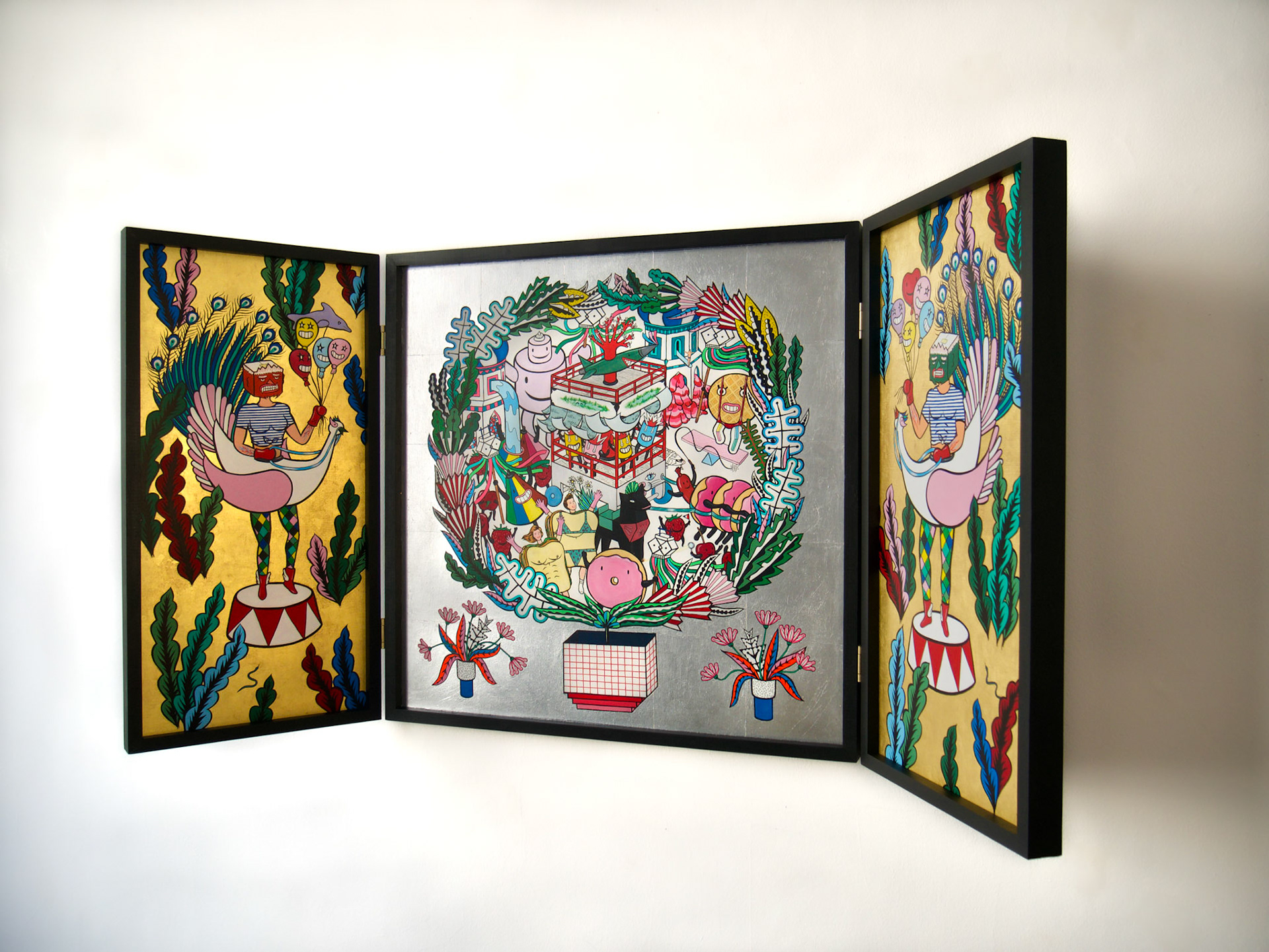 Acrylique sur panneaux de bois,encre de chine, feuilles d'or et d'argent